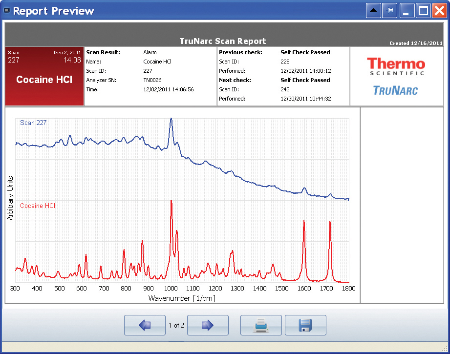 TruNarc lagrar alla skannings resultat inkluderat tid och datum,